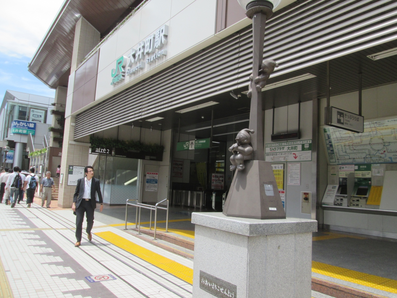 大井町駅の南側にある跨線橋の上に、ラッパを持った小人の像が座っています。気づかずに通り過ぎそうなぐらい小さい像でかわいいです。台座に座っている小人とその上に1人います。JRと東急大井町線の2つのホームの間はこの跨線橋で結ばれています。