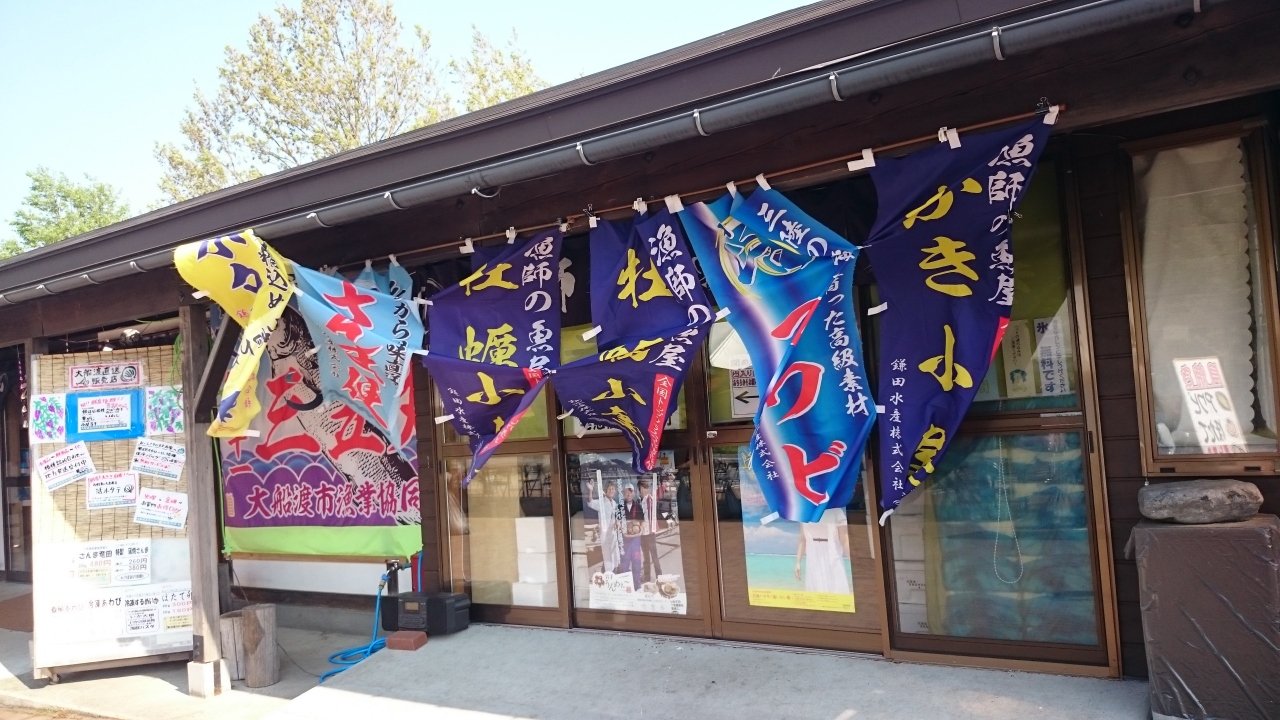 道の駅の敷地内に海産物ばかりを集めて売っているコーナーがありました。入口にカキ小屋、アワビ、ホタテなどののぼりが並んでいます。昔は釜石のほうから行商に来たんでしょうかね。山の幸ばかりでなく、海の幸も一緒に買えるっていいですね。