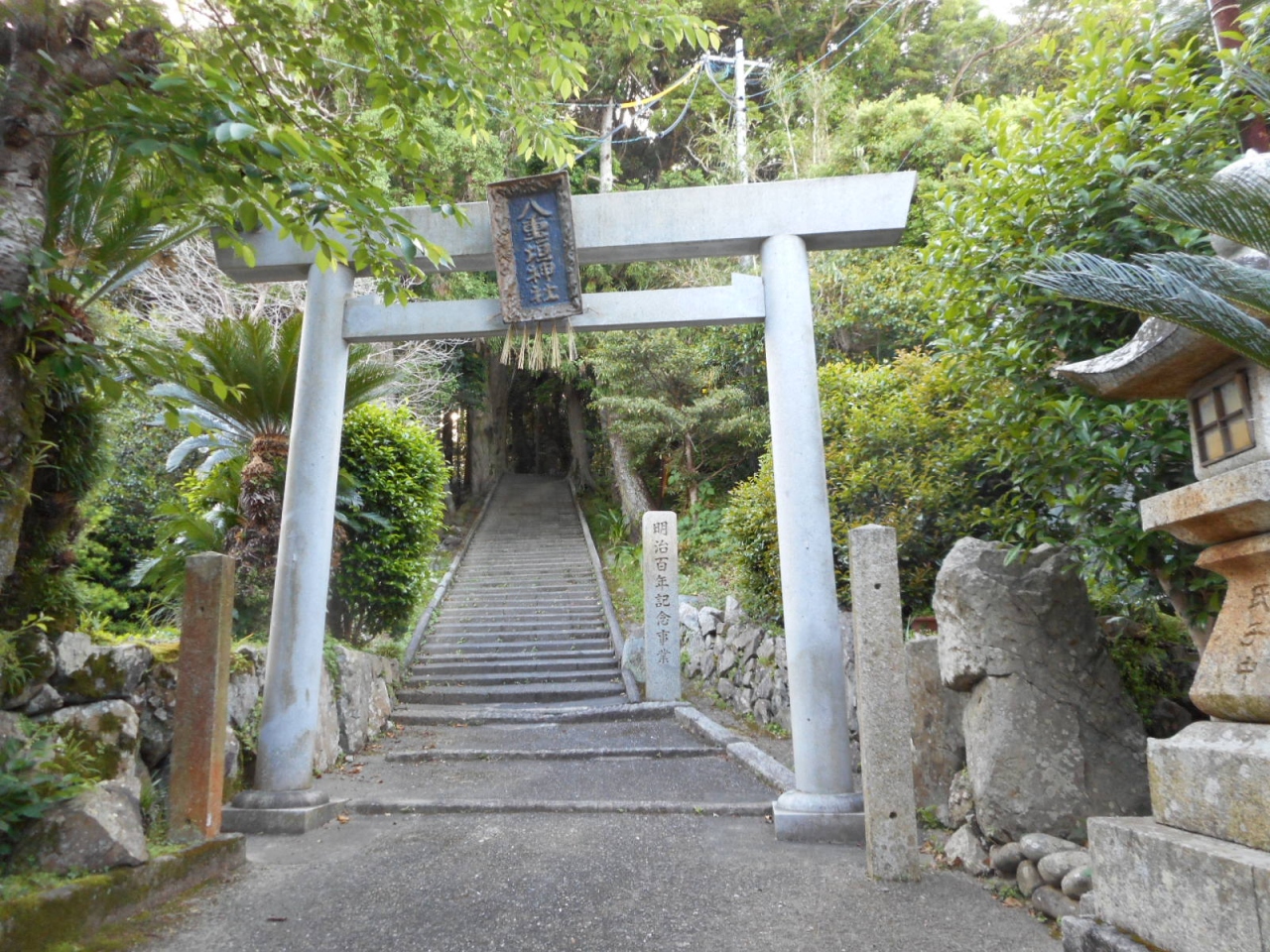 渡鹿野島の数少ない観光スポットです。鳥居のある苔むした階段を登っていくと大楠の横に小さな本殿と御神石があります。本殿は須佐之男神、御神石は産土神が祭神です。縁結び・子宝の神社で、祈願の絵馬がたくさん掛けてありました。