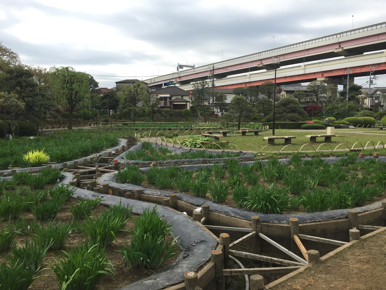 朝9時オープン。この時間だと、ほとんど入園者がおらず、しずかな風景を楽しめる。(なお夏季は1時間早くオープンする)。訪れた4月中旬は、菖蒲はまだ咲いていなかったが、棚藤が咲き始めていて、これはこれで楽しめた。「菖蒲園」を、もう少し広大な土地、明治神宮にある菖蒲園のような感じを想像していた。訪れてみると、けっこうコンパクトで、住宅街の隙間にあるような形であった。