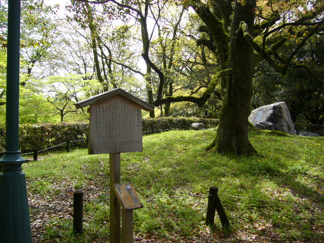 京都御苑内の西側に面する烏丸通りにある下立売御門から入ると左手に清らかに流れている「出水の小川」があります、その東側の石碑が「貽範碑」です。ここには幕末期に久邇宮朝彦親王の邸宅があった場所です。幕末の時代を乗り越えられ67年間の生涯後1891年に没しその後40年後の1931年にそれをしのび、邸宅があったこの地に建立されたものです。また石碑の左側には賀陽宮邸跡の駒札が立っています。