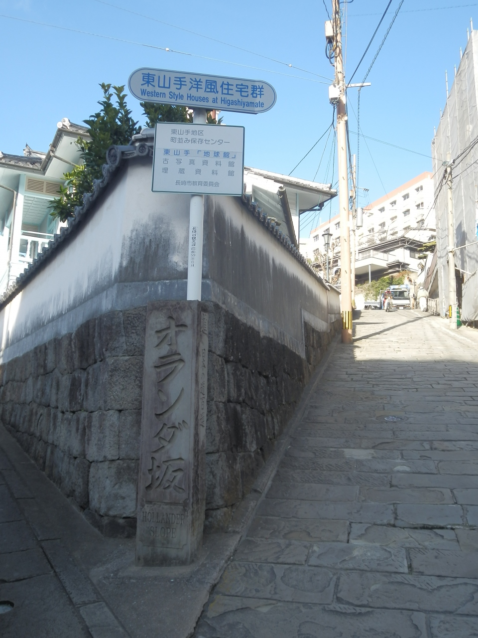 オランダ坂を登っていくと、東山手洋風住宅群という標識が立っています。ここは、重要伝統的建造物群保存地区にある住宅で、長崎市の有形文化財です。7棟の洋風住宅が密集して建っています。資料館になっているので、長崎の歴史がわかります。