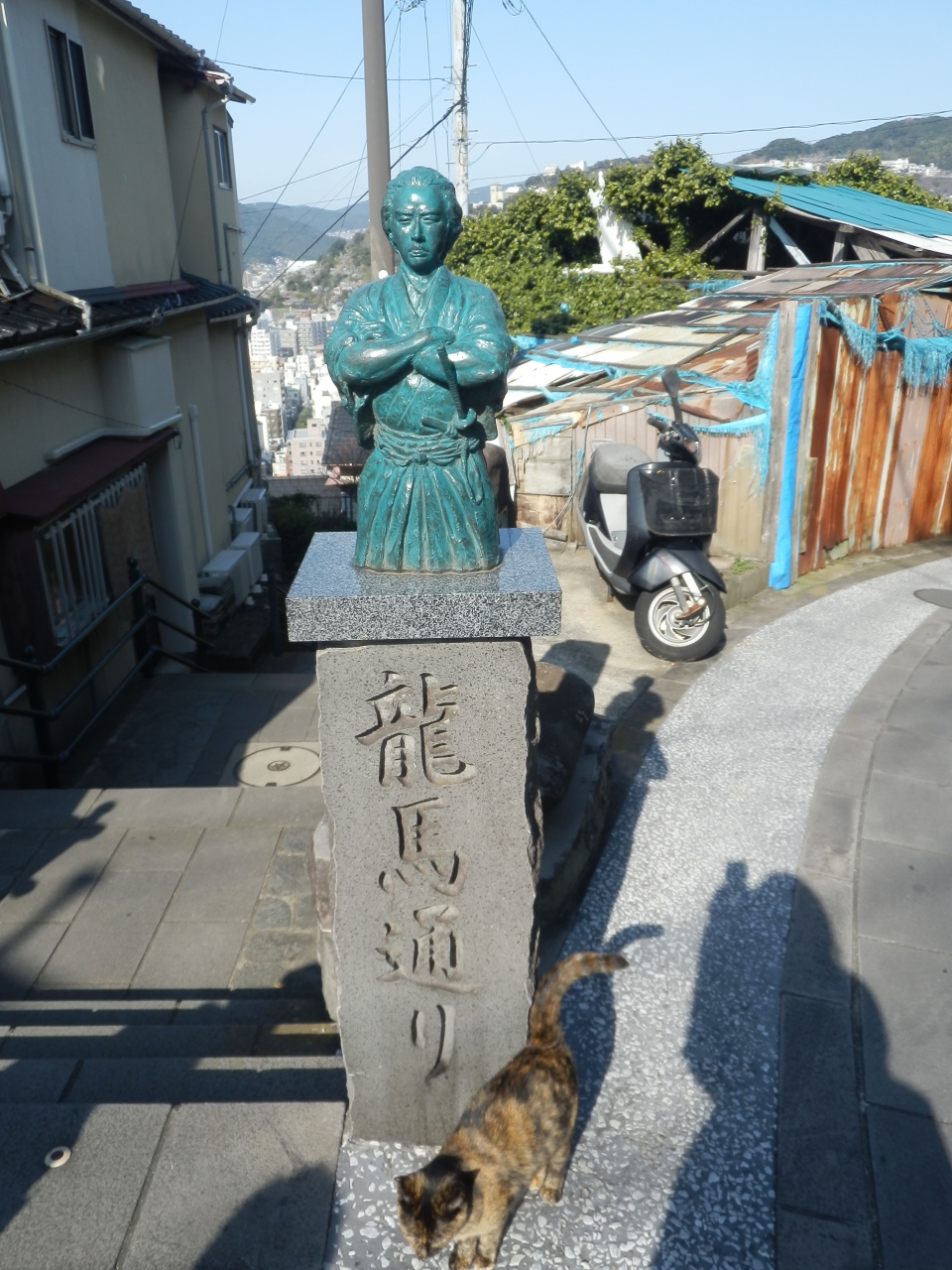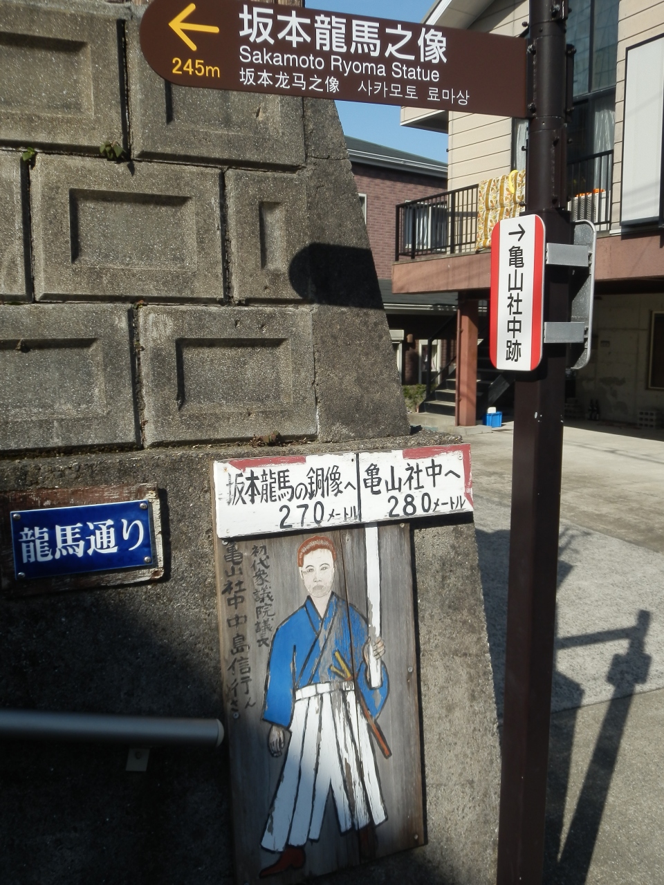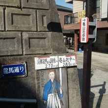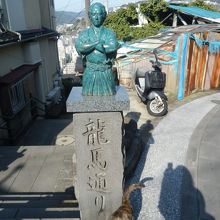 竜馬通りは急な坂道ですが、バスで風頭公園まで行き、下っていけば竜馬通りを通ります。竜馬通りは竜馬ゆかりの地で、竜馬の足跡をたどることができます。細い通りですが、竜馬像、竜馬のブーツ像、亀山山中などがあり標識があるのでわかりやすくなっています。