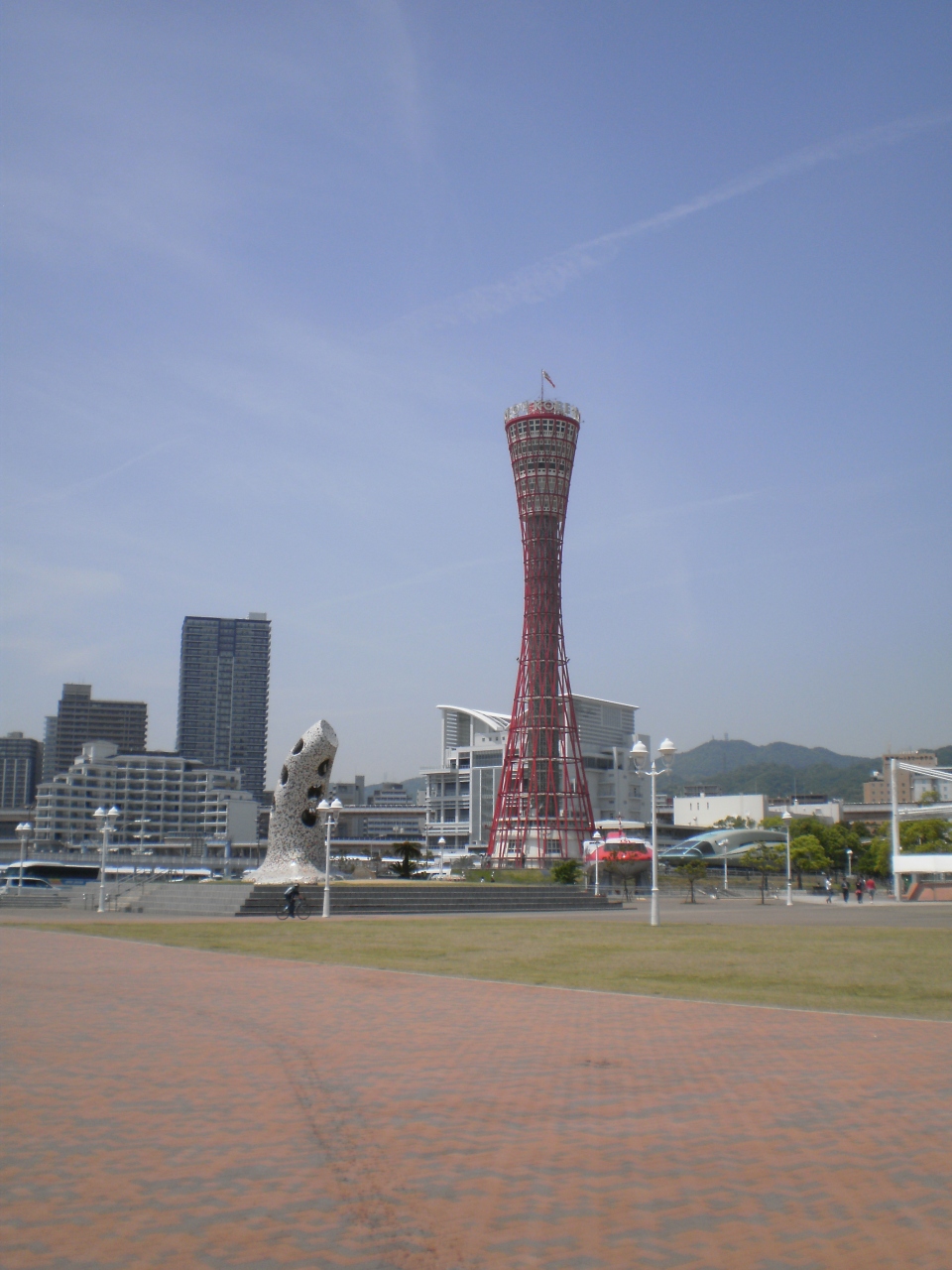 メリケンパークを散策していると、国際的な神戸港らしく色んな記念碑や像などがみにつきます。オルタンシアの鐘は曲線的な塔に穴が開いた大きなモニュメントです。 ファッションイベントの記念なんだそうで、赤いポートタワーをバックに記念撮影をしました。