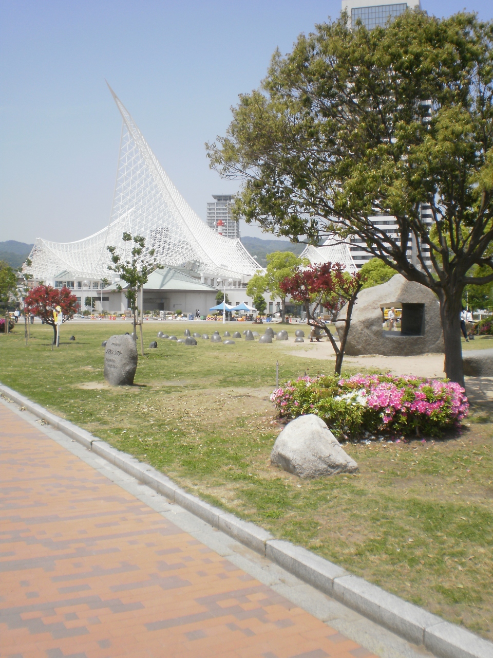 神戸港のメリケンパークにあるオブジェで、日本初の映画上映の記念なのだそうです。 四角くり貫かれた石とその前には、芝生に配置されたよく磨かれた石が並んでいます。 スクリーンを見つめる観衆なんだろうな思います。磨かれた石は上に座るには尖がりすぎているのが残念です。