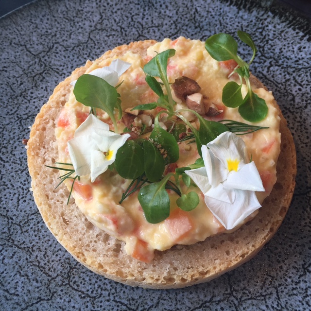 食事にはパンの上にエリディブルフラワーが飾ってあり綺麗です。