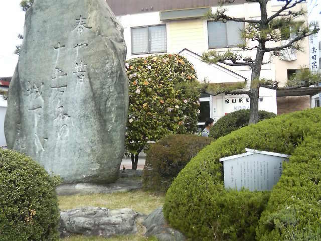 JR松山駅を出て左手、駅前広場の一角の植え込みの中に建っています。