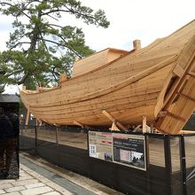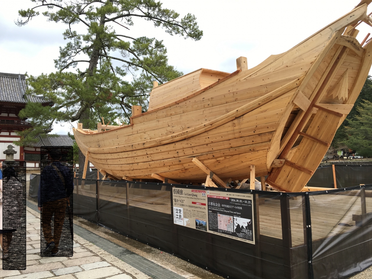 東大寺の大仏殿前にある池です。池のほとりに木製の大きな船が展示されていました。「東アジア文化都市2016」の美術部門のプロジェクトだそうで、東アジア伝統の木製の帆船をつくり、完成したものを鏡池に浮かべるとか。この船が鏡池に浮かぶのかな?