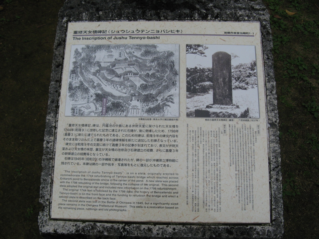 石碑の表裏面には、漢文で王府が実施した天女橋の修理に至る経緯や工事の組織体制・経費などが刻まれています。詳細については、現地にあった説明板の写真を添付しますので参照ください。