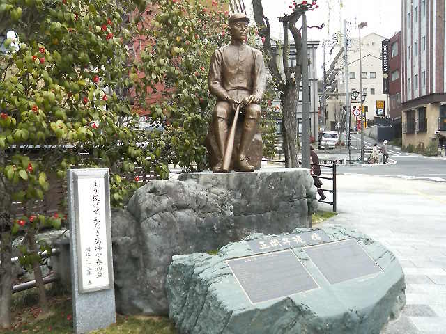 伊予鉄道・道後温泉駅から歩いて数分、カラクリ時計や足湯などがある広場の片隅にある茶色い銅像です。