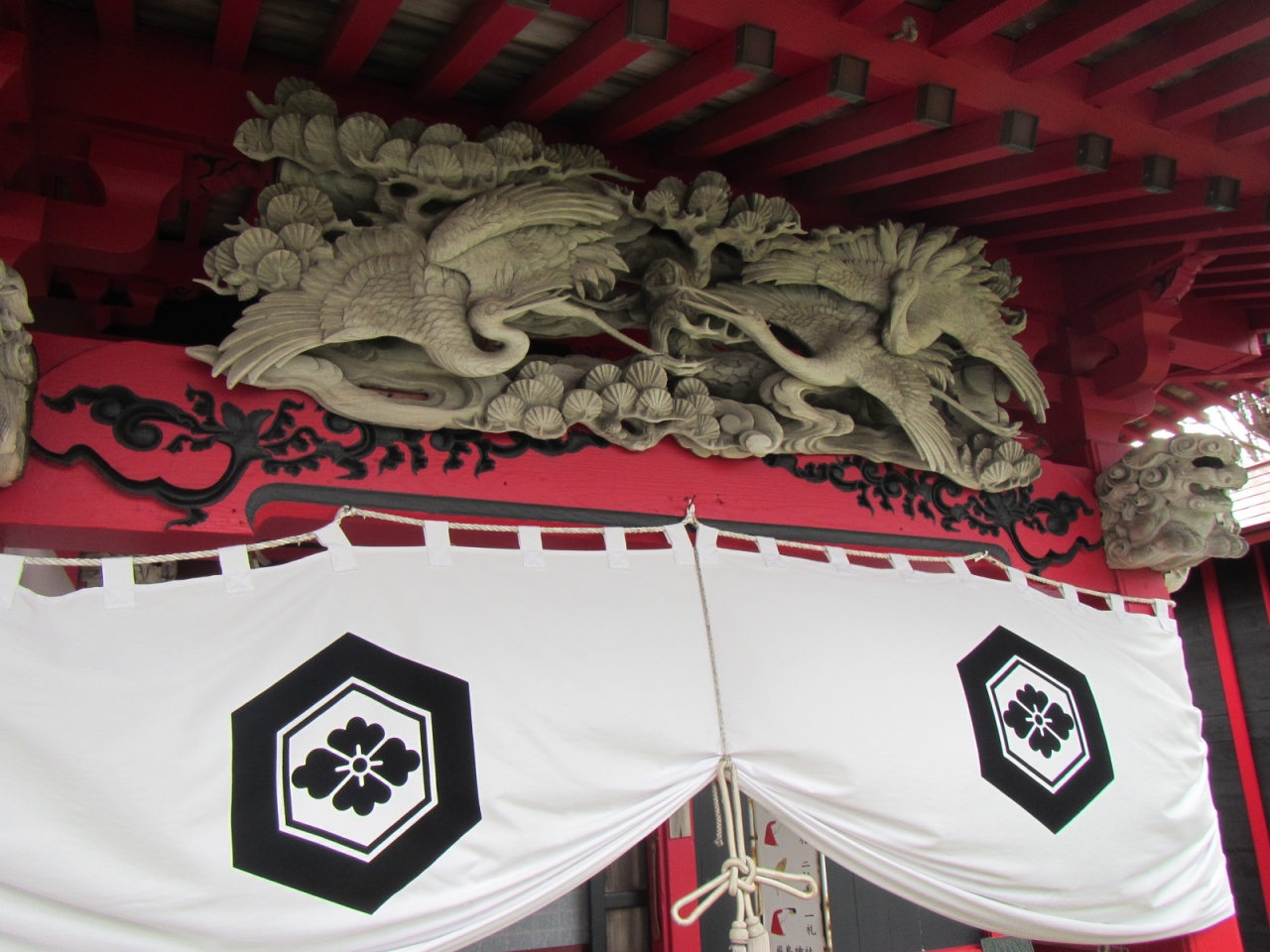 桜以外の時期でも、本殿に見事な彫り物が掛かっています。
