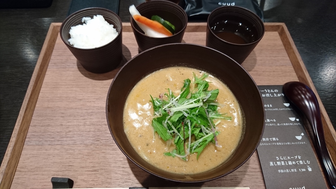 今回は初めてだったので朝食セットを頼みました。カレーうどんにご飯が少し、それにスープを割返す出汁が小さな器に、よそわれて出てきました。