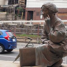 この像はしゃがんでいて近くには傘とカバンが置いてあってまるで旅の途中?