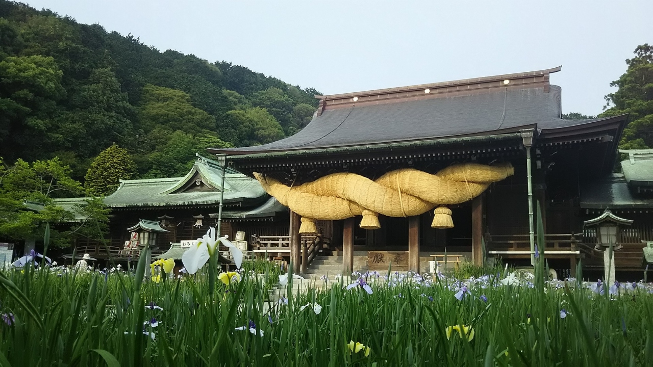 本殿前には、白・紫・黄色の菖蒲がたくさん並んでいました。参道から本殿に続く石段のひとつひとつにも菖蒲の鉢が置いてあり、その涼し気な色合いで、石段を登る暑さが和みました。歩いていて、とても気持ちよかったです。