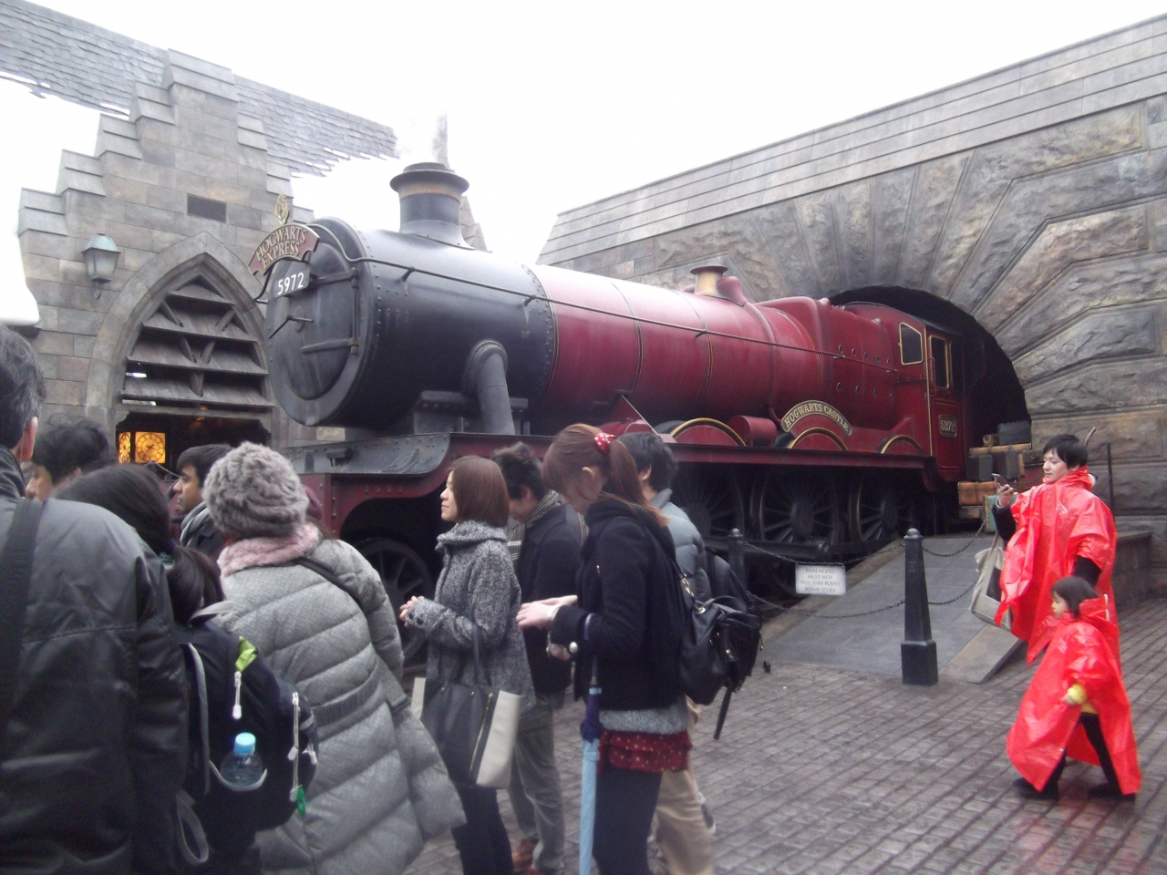 大阪にあるユニバーサルスタジオのアトラクションのハリーポッターエリアにあります。このエリアに入るのに整理券が必要でした。エントランスをくぐるとすぐに見えてくるのが、この機関車です。ハリーポッターをほとんど見たことのない私はよく分かりませんでしたが、とりあえず写真撮影をしました