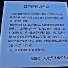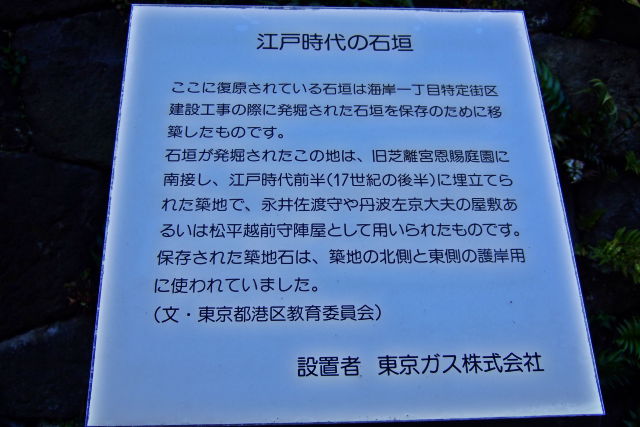 ここに復元されている石垣は海岸一丁目特定街区建設工事の際に発掘された石垣を保存するために移築したもの。 石垣が発掘されたこの地は、江戸時代前半に埋め立てられた築地で、保存されている築地石は、築地の北側と東側の護岸用に使われていたものなのだそうです。