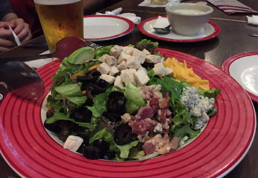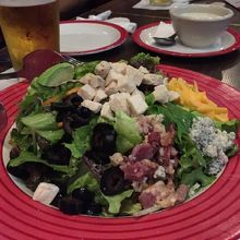 レタス、トマト、アボカド、チキン、ゆで卵、ベーコン、ブルーチーズ(フレンチドレッシングまたはヴィネグレットソースでミックスしたサラダ!
