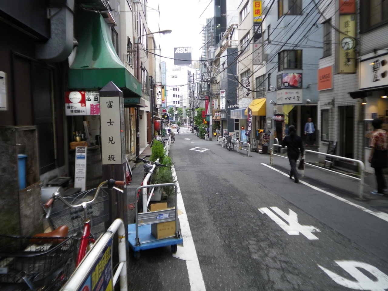 明大通りから靖国通りに向かうショートカット的な道。坂というよりは勾配のある道といった短い通り。かつては富士山が展望できる坂であったのだろうか。その名残はこれっぽっちもない飲食街の裏通りとなっています。