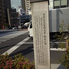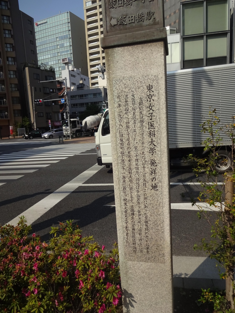 この標柱に悦明によると女医であり、教育者としても知られる吉岡弥生がここに幻次の東京女子医大の前身「東京女医学校」を創設した由。