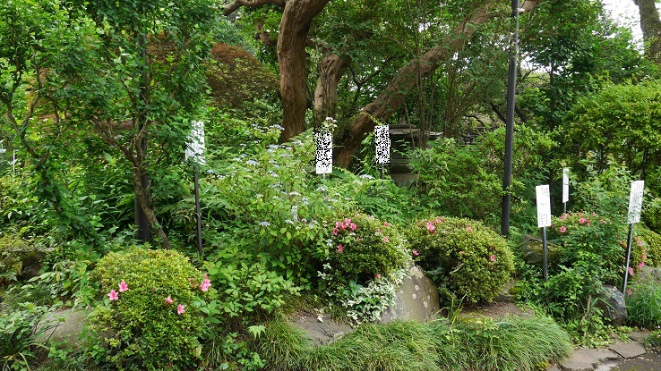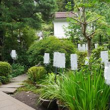 お鷹の道沿いに建てられている寺院。万葉植物園なる看板が掲げられ内部はたくさんの植物とともに歌を記した立札が掲げられている。森の中にも続いており、そちらのほうは鬱蒼とした雰囲気だった。周辺の雰囲気とあわせて静かな場所だった。