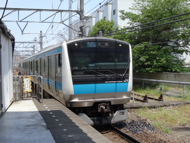 京浜東北線とつながって、横浜から桜木町、関内、石川町などを通って大船まで行く通勤路線です。通勤電車を待っていると時々貨物列車も走るのがおもしろいところです。