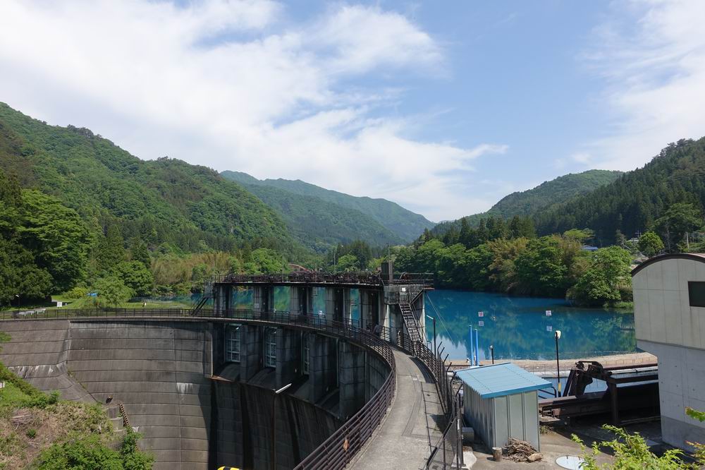 - 青緑色のダム湖。