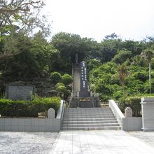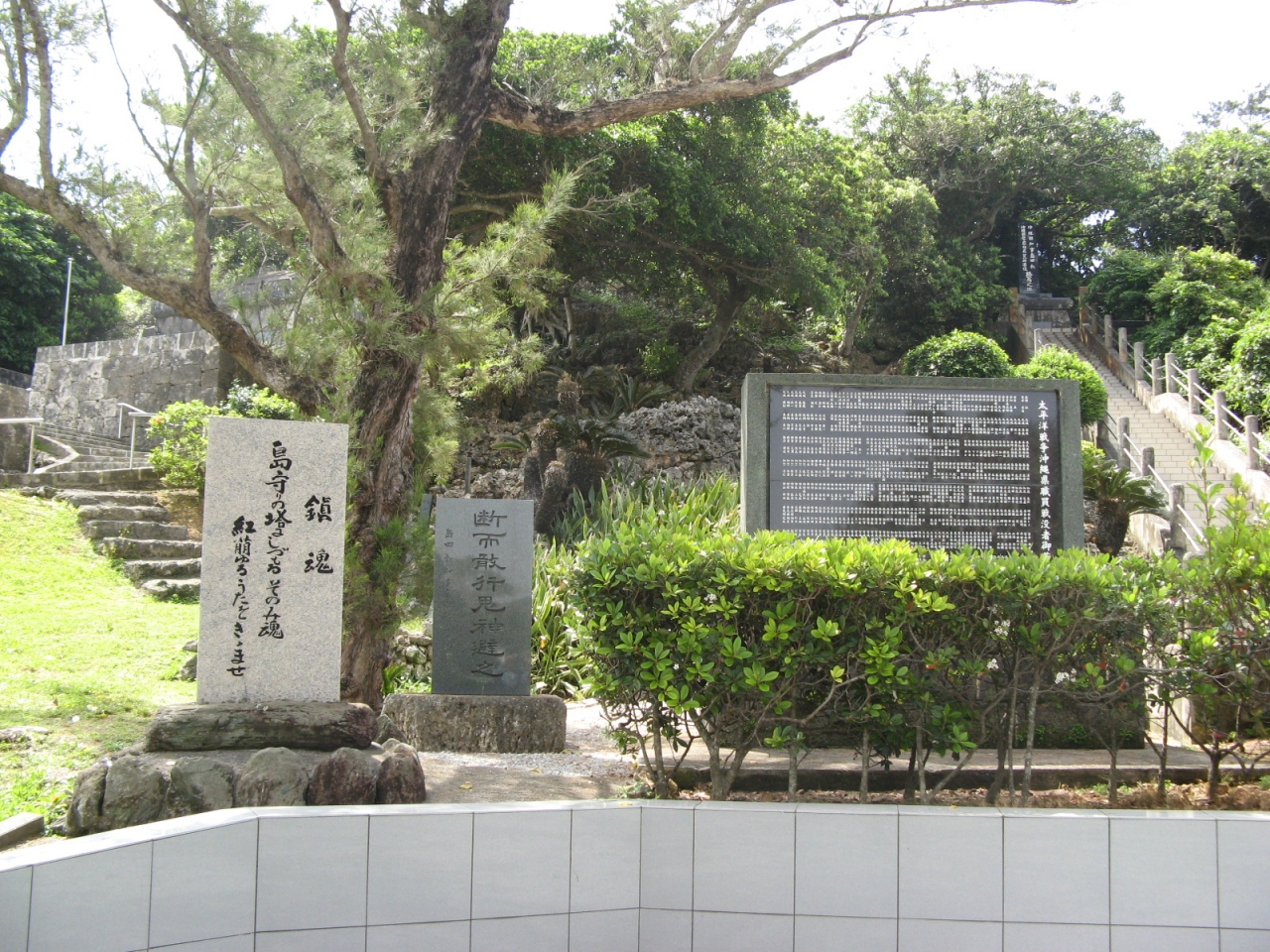 「島守の塔」は、平和祈念公園内の霊域ゾーンにあります。沖縄県最後の官選知事であった島田叡知事と荒井退造警察部長ほか戦没した458人の県庁職員を合祀した塔です。