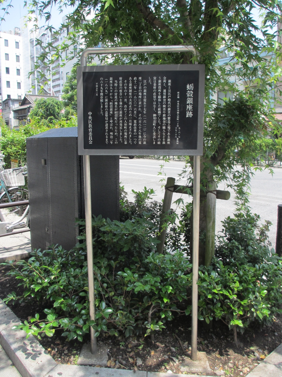 日比谷線人形町駅出口A2を出た植え込みの中に説明板が立っています。1800年、銀貨の製造と検査を行っていた銀座役所がこの地にあったことを記念しています。今は説明板だけで当時の面影は見られませんが、町の中心として活気があった姿が想像できます。