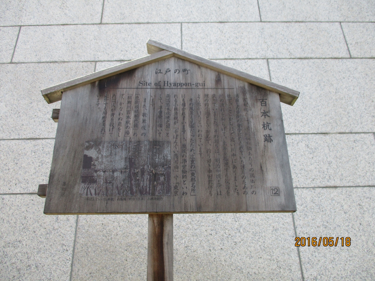 JR両国駅西口から国技館通りを横断し両国パールホテルの前に百本杭跡説明板が立っています。それと両国橋の東詰たもとにも「両国橋と百本杭」の案内板があります。案内板に19300年に荒川不水路が完成するまで、隅田川には荒川、中川、綾瀬川が合流していたので、隅田川は水量が多く、湾曲部ではその勢いが増して川岸が浸食され両国橋付近は湾曲がきつく流れが急であったため無数の杭が川に打ち込まれ水流を緩和させていたので百本杭と呼ばれるようになったそうです。津波対策の先人たちの知恵です~