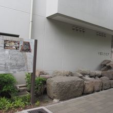 小伝馬町駅のすぐ北西、江戸通りに並行して走る一本北側の道沿いにある十思公園内左手の十思スクエアの前に出土した石垣の石と説明板があります。この地には1618年頃から明治8年まで牢屋敷があり、平成24年に発掘調査が行われたそうです。