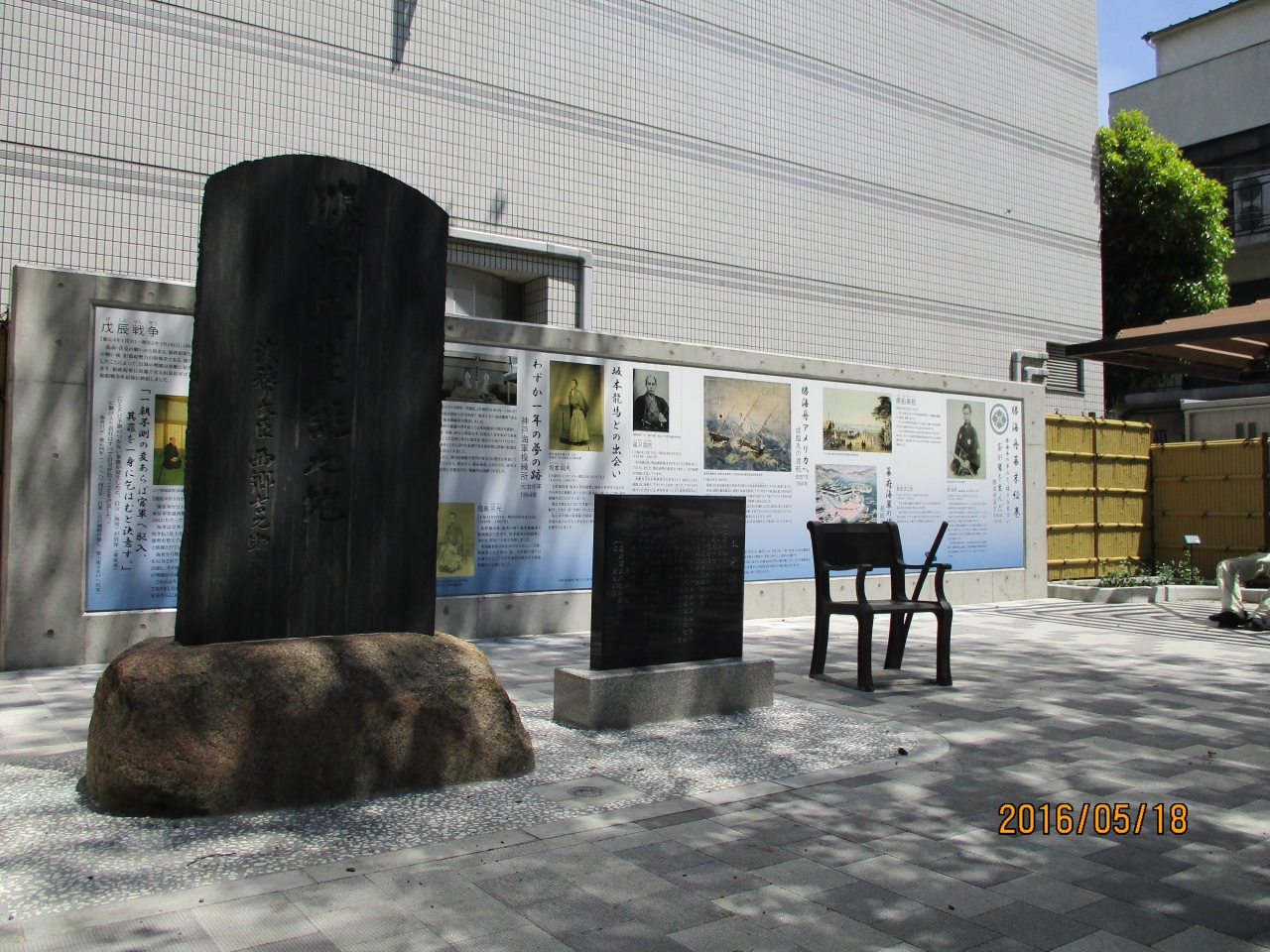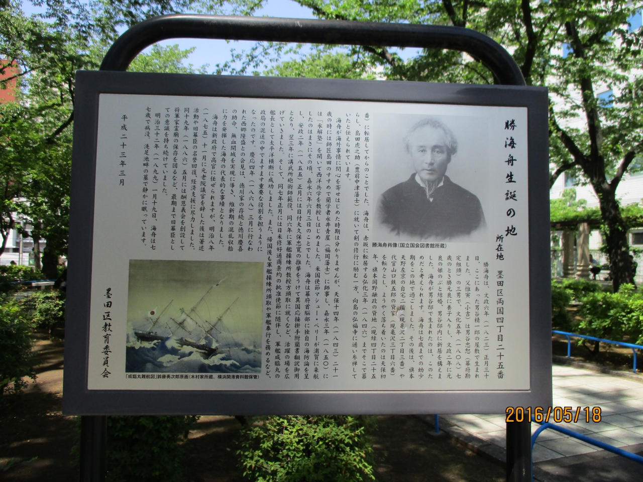 JR両国駅東口から横綱横丁を通り抜け京葉道路を横断し住宅街の両国小学校の隣に両国公園内に勝海舟生誕の地の碑、説明ボード、勝海舟絵巻があり見どころ豊富です。歩いて5分ぐらいで着きます。石碑には幼名麟太郎、蘭学海洋術を学び幕府の軍艦咸臨丸の艦長を務めた等刻まれています。
