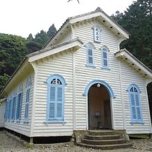 淡いクリームの外壁に窓枠と鎧戸のブルーがマッチしていて,本当に愛らしい感じの教会で,五島列島で一番愛らしい教会かもしれません