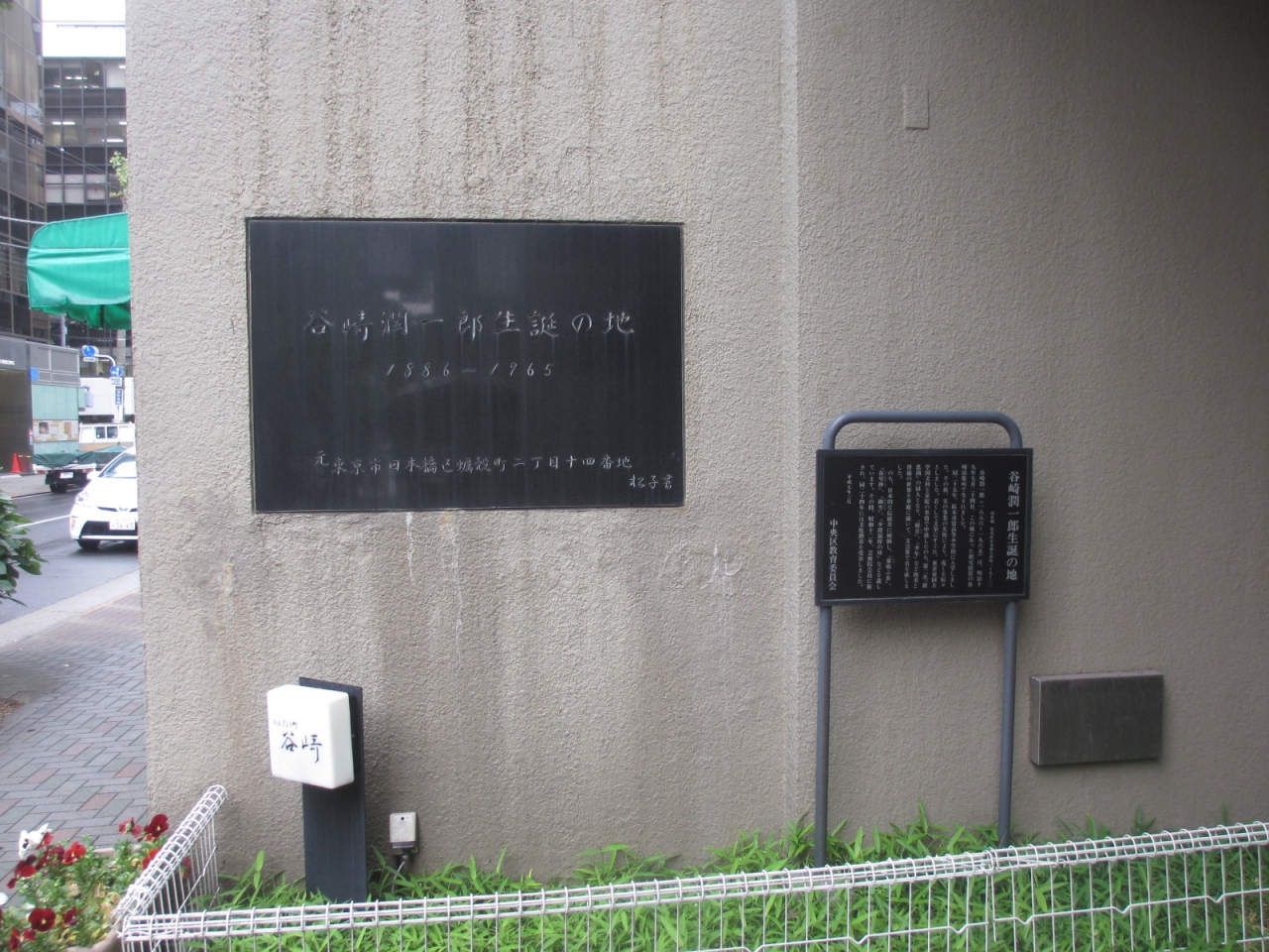 人形町通りで、甘酒横丁交差点から南西方向に(甘酒横丁の反対側に)進むと2ブロック目の、有名洋食店小春軒の隣のしゃぶしゃぶ店「たにざき」の壁にプレートと中央区教育委員会が設置した説明板があります。谷崎潤一郎はこの地にあった祖父経営の谷崎活版所で生まれたそうです。プレートと説明板しかないのは残念ですが、谷崎ファンのかたは訪れてみてはいかがでしょうか。