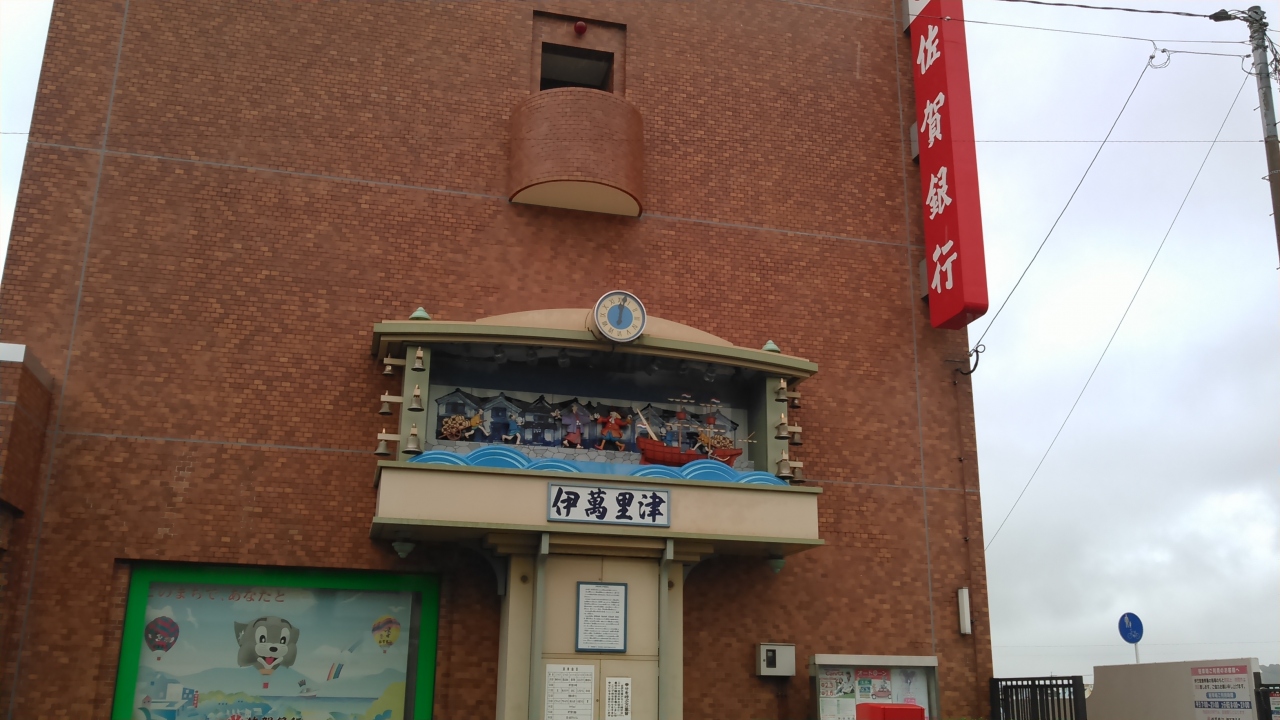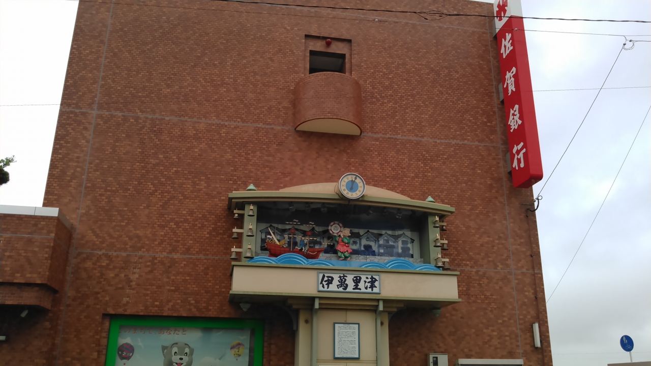 バスツアーで伊万里を訪れました。ボランティアガイドさんが、約1時間3つの縁起橋や、伊万里神社、白壁の家々などを回り、最後にここに連れて行ってくれました。佐賀銀行の通りに面したところにあり、道路の向こう側から眺めました。時刻によって音楽は変わるようでした。船が出航して戻るまでの約5分間の人形たちの動きが見られました。