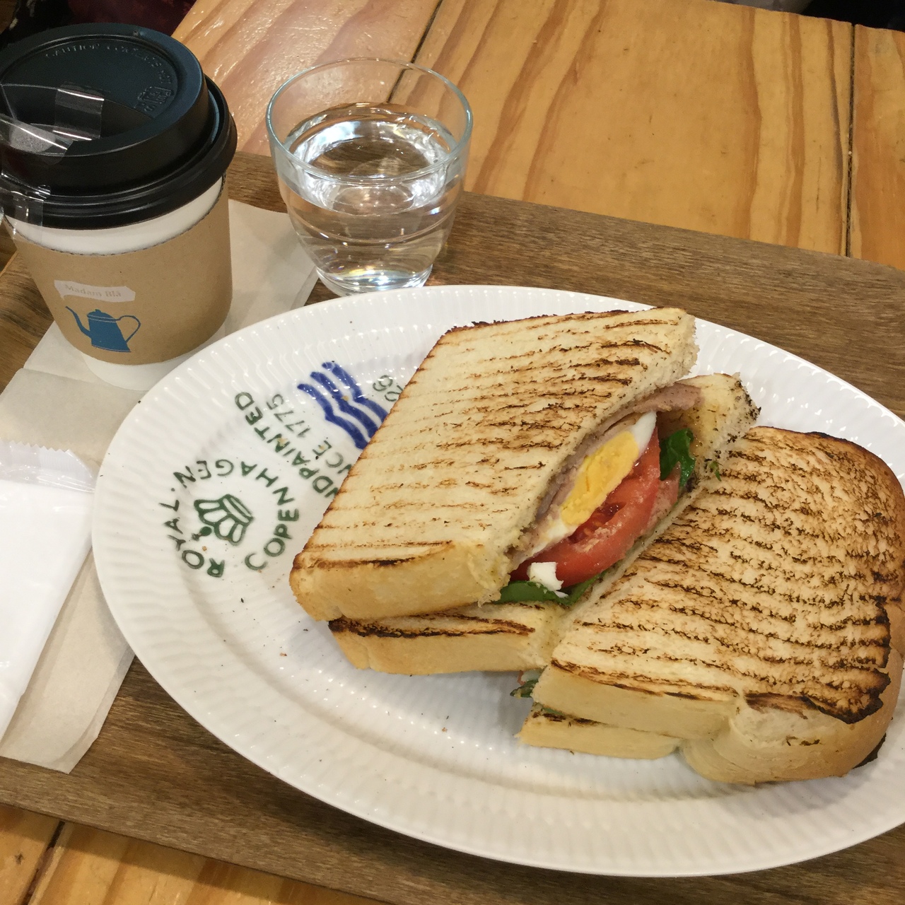 目玉焼き、ベーコン、トマトを挟んだトーストサンドは、ほんのり甘い優しい味付けです。
