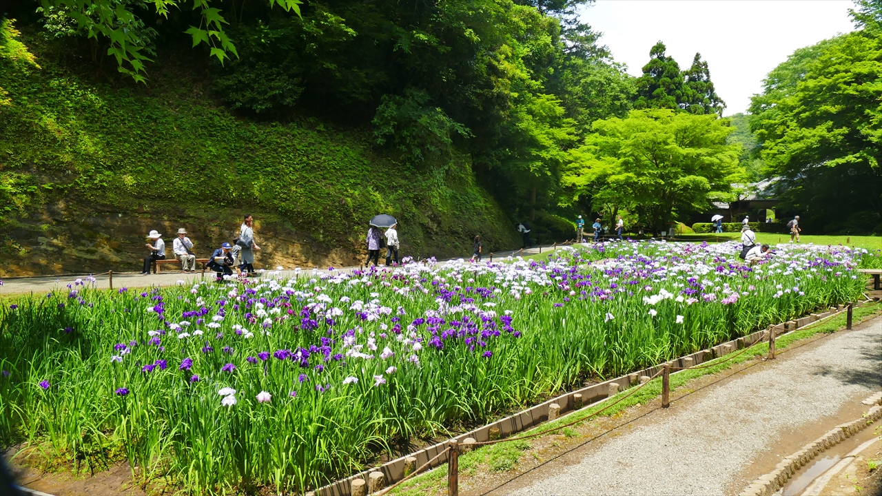 【明月院本堂後庭園】花菖蒲苑。所によりネギ畑(意味不明)