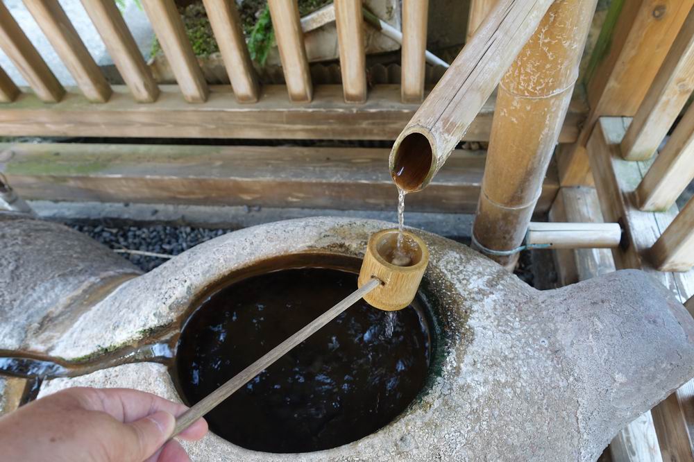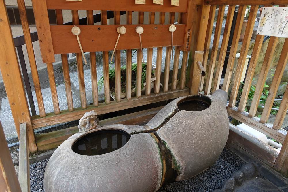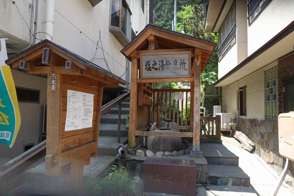 桐ノ木平商店街の店と店の狭い場所にあります。位置的には四万郵便局のはす向かい。屋根が付いていてひょうたん型のつくばいに温泉がちょろちょろと出ていました。掲示に「飲泉所の泉温55.5℃」と書かれているとおり、ぬるいというよりはちょっと熱く感じます。ほのかに塩を感じ、それゆえ塩之湯という名前が付いたのかも。