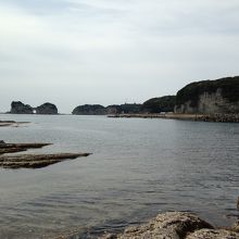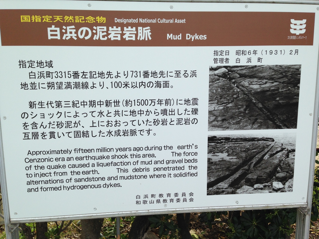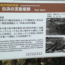 また、足湯の前の海岸には、国指定特別天然記念物の白浜の泥岩岩脈という岩がある。