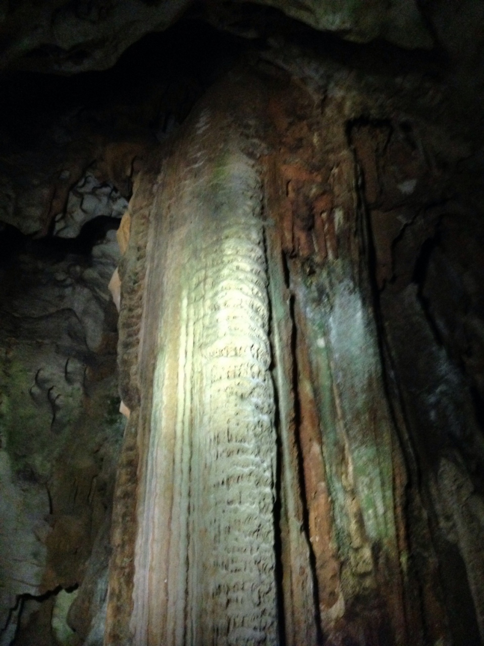 秋芳洞のメインスポットのひとつ。多大な年月がつくりあげた柱は迫力あります!また上を見上げると穴がたくさんあいており、黒いものがついていましたが、コウモリのうんこだそうです笑。観光地化で照明が入る前はコウモリがたくさん住んでいたのだとか。見ていたら、ほんとにコウモリが穴から飛び立ちました。