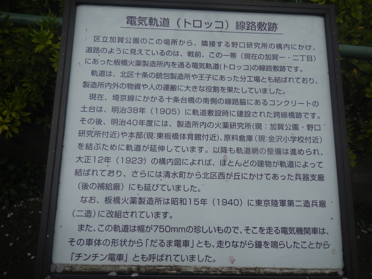 石神井川沿いにある公園。加賀藩の下屋敷の庭園にあった築山の跡が公園になっている。この場所が明治になってから終戦まで、陸軍の板橋火薬製造所となる。その名残として電気軌道(トロッコ)線路敷の跡が残っている。