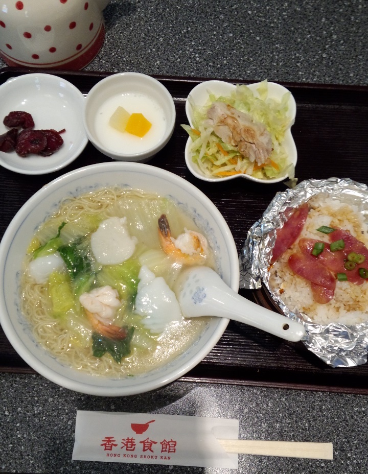 オーダーして比較的すぐやってきましたが、海鮮汁ソバはちゃんとエビやイカが入っていて、細い麺にあっさりとしたスープで美味しかったです。