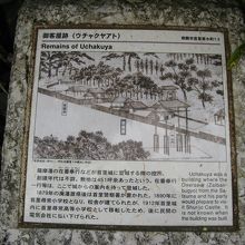 石標には、古い御客屋の絵図とともに、『薩摩(さつま)藩の在番奉行(ざいばんぶぎょう)などが首里城に登城(とうじょう)する際の控所。創建年代は不詳。敷地は451坪余あったという。在番奉行一行等は、ここで城からの案内を待って登城した。1879年の廃藩置県後は首里警察署が置かれた。1890年に首里尋常小学校となり、校舎が建てられたが、1912年首里城内に首里尋常高等小学校として移転したため、後に民間の電気会社に払い下げられた。』と表記されています。