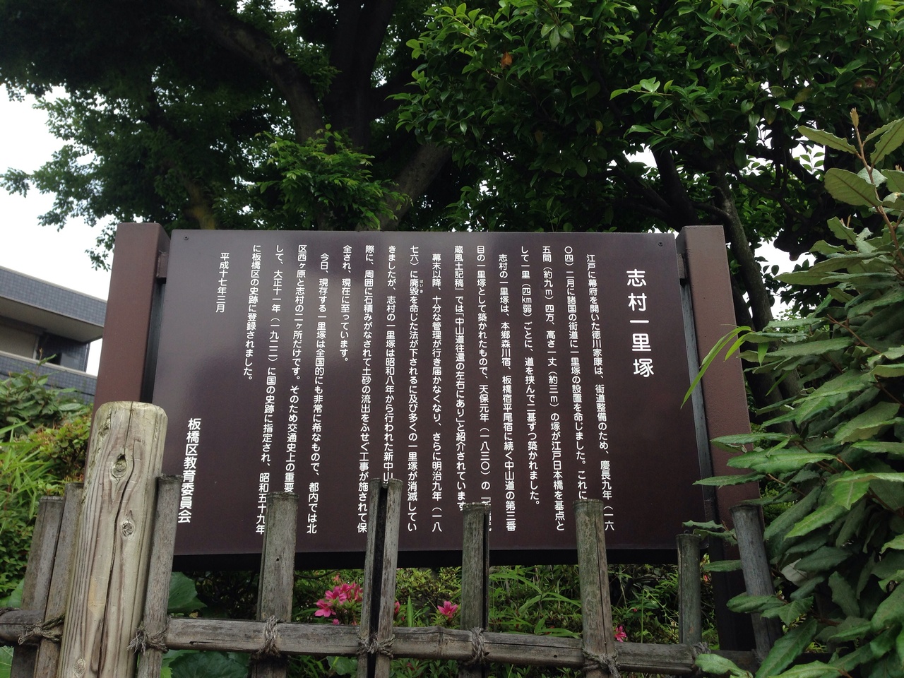 日本橋から三里目のここは 中山道に残る二つの一里塚のうちのひとつ。歩道を遮るようにあり 大きな木が目立つのですぐにわかります。今でこそ通り沿いですが、当時は中山道から少し奥まってあったそう。