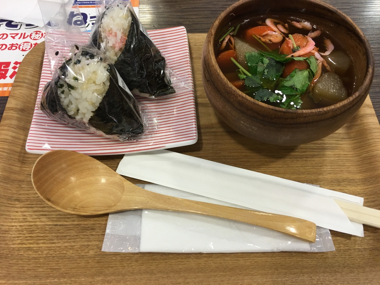 スープとおにぎり2個セットが600円ほどでいただける、SAではホッとできるメニューです。