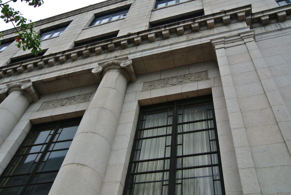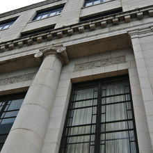 海岸通りに並ぶレトロ建築のひとつで、イギリスのチャータード銀行の神戸支店として、1938年に竣工した建物です。銀行建築らしく、正面にイオニア式の柱がならび、均整と取れた姿をしています。現在はレストランやカフェなどが入っています。