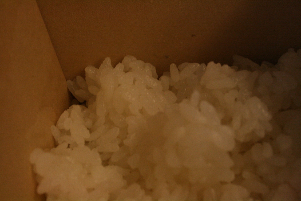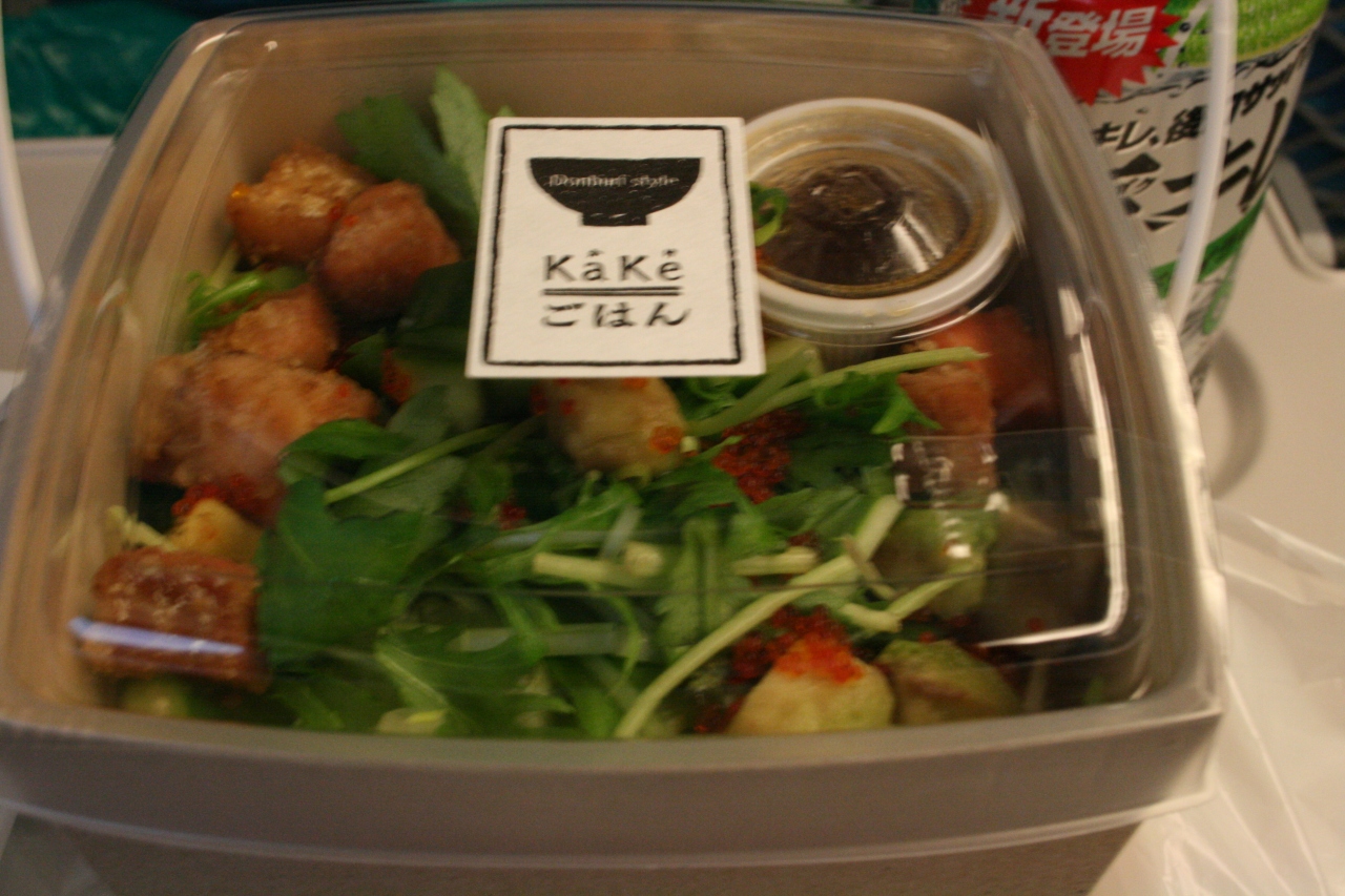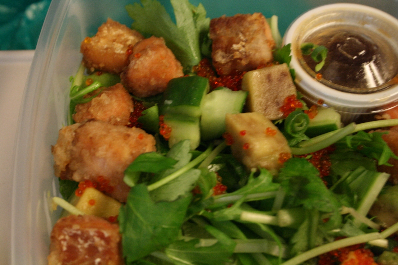 サーモンは揚げてあります。二段重ねとなっており、ご飯は酢飯でした。