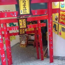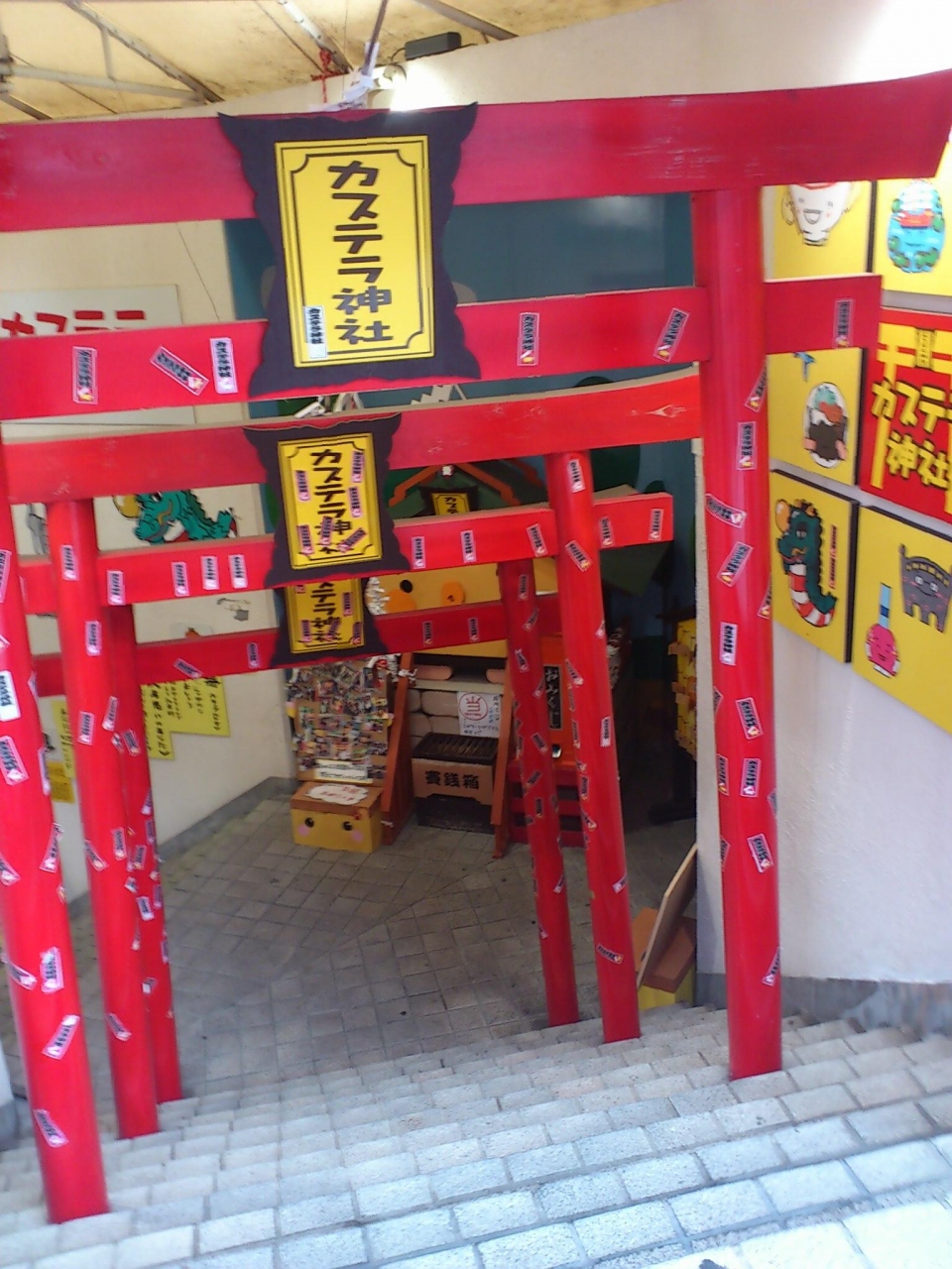 グラバー邸と大浦天主堂に行きました。路面電車の大浦天主堂下という駅で降り、坂を登って行き、大浦天主堂のすぐ側まで来ると、左側にカステラ神社という看板を見つけました。下の階段に赤い鳥居が並んでいて、その下にあります。観光客呼び込み用です。