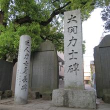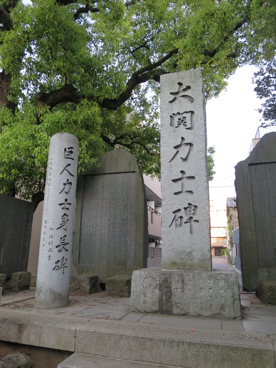富岡八幡宮の鳥居右手の参道に大関力士碑はあります。ちなみに裏には巨人力士身長碑があります。大関力士碑には小錦、増位山など馴染の力士の名前が刻まれており、知った力士を探すのも面白いです。もともとは横綱位はなく大関が最高位だったそうです。