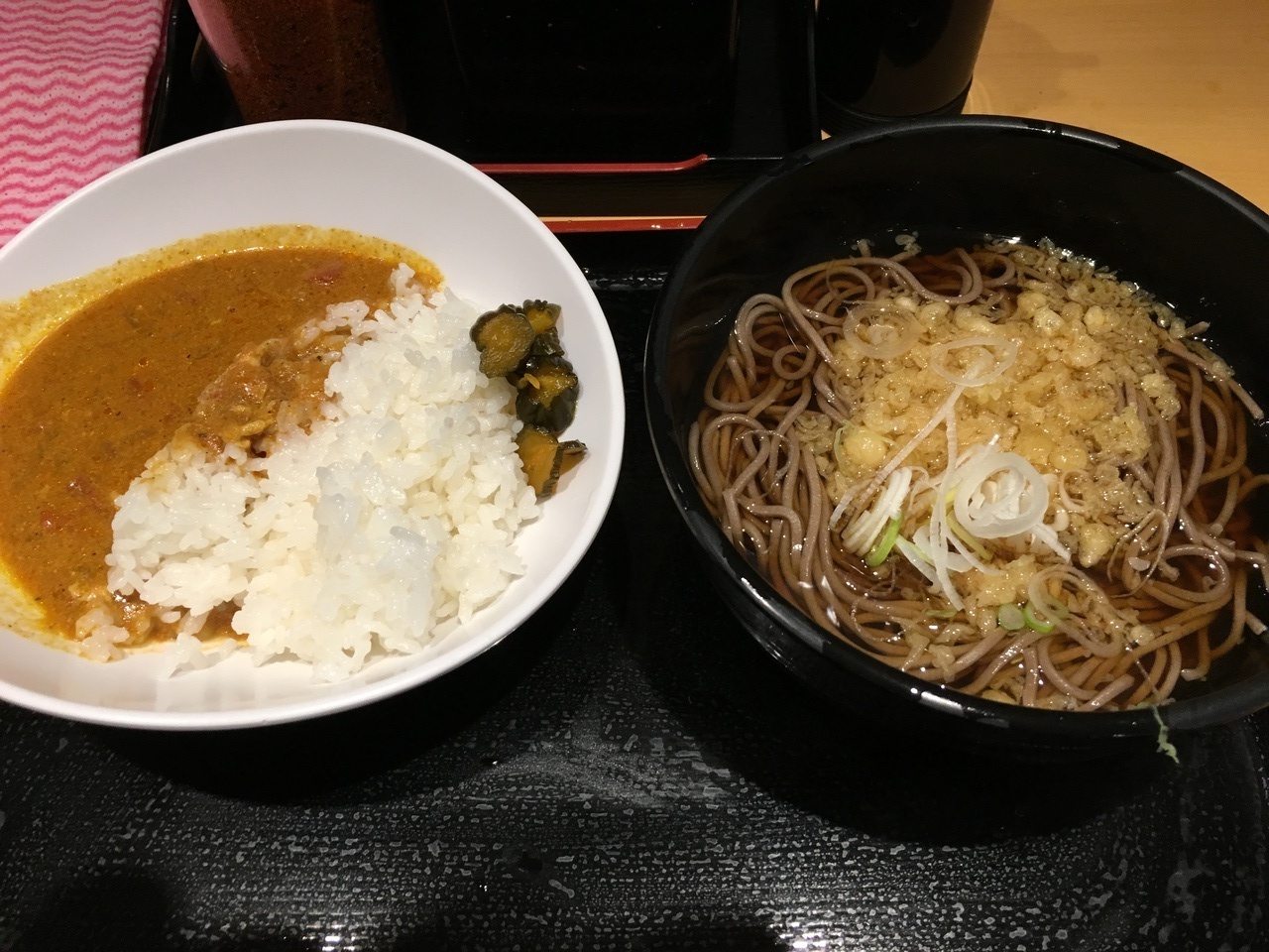 朝はたぬきそばと鶏肉の入らない半カレーのセットが390円でオススメです。