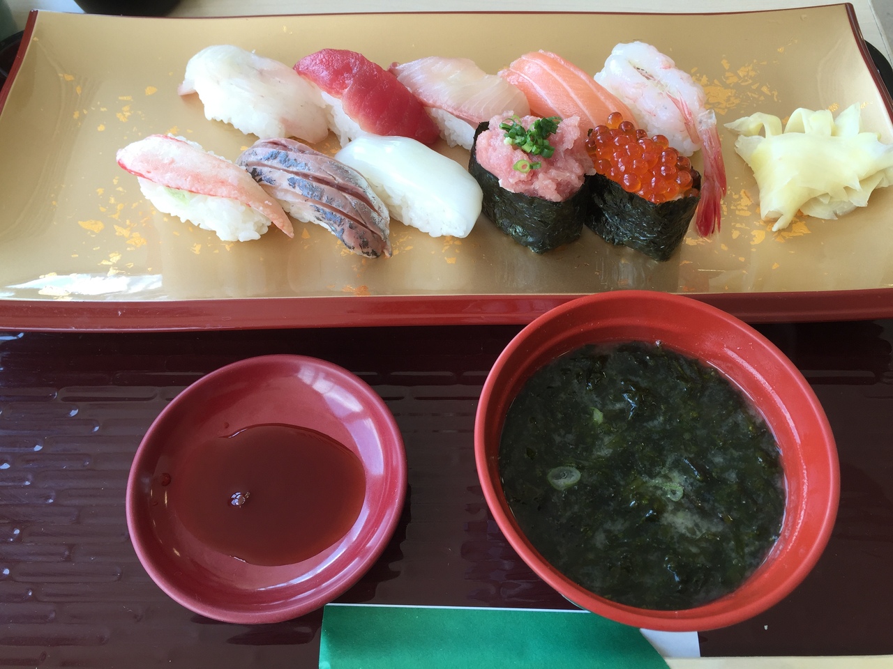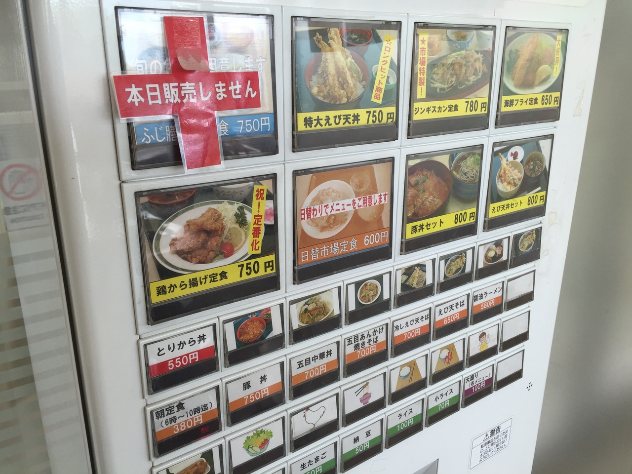 市場の立地を生かして破格の値段設定がされている。丼や定食部門と寿司部門に分かれている。どちらも食券を買って受け取るセルフ。この日の目玉はウニ丼、1,200円。